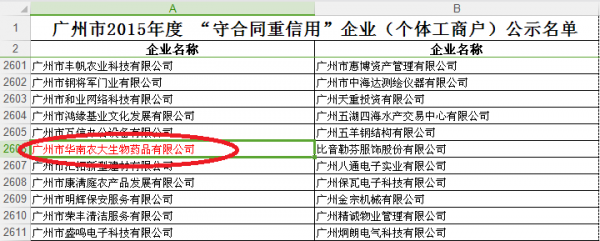 根據(jù)廣東省工商行政管理局《關于印發(fā)廣東省守合同重信用企業(yè)公示活動規(guī)則的通知》(粵工商市字〔2009〕697號)和廣州市工商行政管理局《關于守合同重信用公示活動有關問題的通知》(穗工商合〔2013〕209號)精神,經廣州各行業(yè)協(xié)(商)會推薦,并征求各有關部門的意見,認為廣州市華南農大生物藥品有限公司符合廣州市2015年度 “守合同重信用”公示條件。