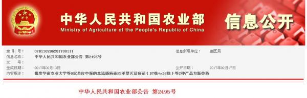 熱烈祝賀華南生物禽流感病毒H5亞型滅活疫苗(D7株+rD8株)獲新獸藥證書