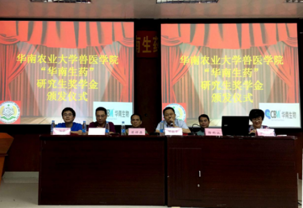 2017年5月24日上午,廣州市華南農(nóng)大生物藥品有限公司(下稱“華南生物”)在廣州華南農(nóng)業(yè)大學(xué)獸醫(yī)學(xué)院開展了2017年“華南生藥”研究生獎學(xué)金頒獎典禮,同時(shí)進(jìn)行了“創(chuàng)新中的華南生物及就業(yè)指導(dǎo)”課程分享。