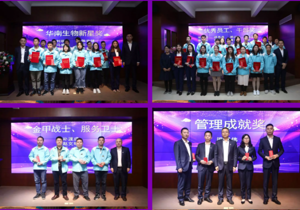 2019年,涌現出一批批表現優秀的管理人員、基層人員與團隊進行了表彰頒獎。現場頒發的獎項依次是:華南生物新星獎、優秀員工獎、優秀干部獎、服務衛士獎、金甲衛士獎、管理成就獎、管理卓越獎、優秀專家獎、最佳支持團隊獎、攻堅克難團隊獎、最佳保質保量團隊獎、王者之師團隊獎。