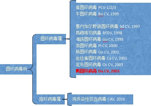 最早在2002年,德國科學(xué)家Hattermann 發(fā)現(xiàn)勃蘭登堡某養(yǎng)鴨場(chǎng)的法國番鴨表現(xiàn)出羽毛凌亂、生長遲緩、體重減輕等癥狀,認(rèn)為這與其他禽類感染圓環(huán)病毒后的臨床特點(diǎn)很相似,于是對(duì)樣品進(jìn)行負(fù)染電鏡(EM)檢測(cè)發(fā)現(xiàn),法氏囊中存在無囊膜的球狀病毒,直徑大約為 15~16nm。最終根據(jù)圓環(huán)病毒rep基因的鑒定,發(fā)現(xiàn)與其他圓環(huán)病毒同源性僅39%~60%,與鵝圓環(huán)病毒同源性最高,但也僅為82%。推斷新發(fā)現(xiàn)的可能為新的圓環(huán)病毒,鴨圓環(huán)病毒DuCV。