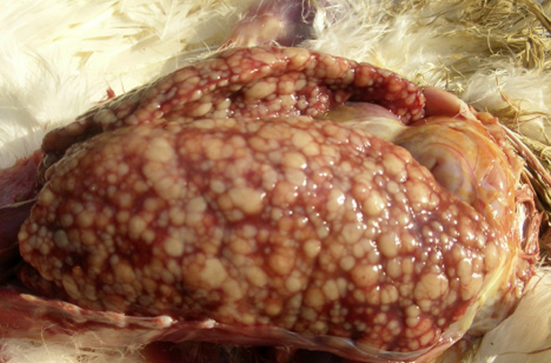 7、禽淋巴細胞白血病:肝臟異常腫大,可覆蓋整個腹腔,表面彌漫性腫瘤病灶,腫瘤表面灰白色且光滑、切面灰白色。