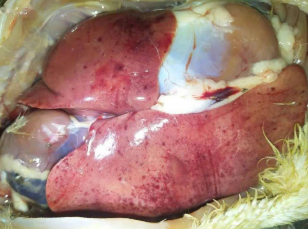 鴨肝炎病毒潛伏期一般為1~4d,突然發病,病程短促。病初表現為精神萎靡,眼半閉呈昏睡狀,羽毛松亂,翅下垂,行動呆滯,縮頸呆立,食欲不振甚至厭食、絕食;發病12~24h即出現神經癥狀,病鴨全身性抽搐、運動失調、兩腳痙攣,身體倒向一側或就地旋轉,頭向后仰呈角弓反張狀,故俗稱“背脖病”。少數病鴨死亡前排黃白色和綠色稀糞,數小時后死亡。也有的雛鴨無明顯臨床癥狀便突然死亡。 剖析可見肝臟特征性病變:肝臟腫大,質地柔軟,呈淡紅色或花斑狀,表面有出血點和出血斑,膽囊擴張,充滿膽汁。脾臟有時腫大,也呈斑駁狀。腎臟充血、腫脹,呈暗紫色樹枝狀。