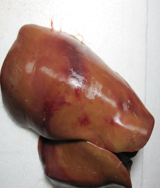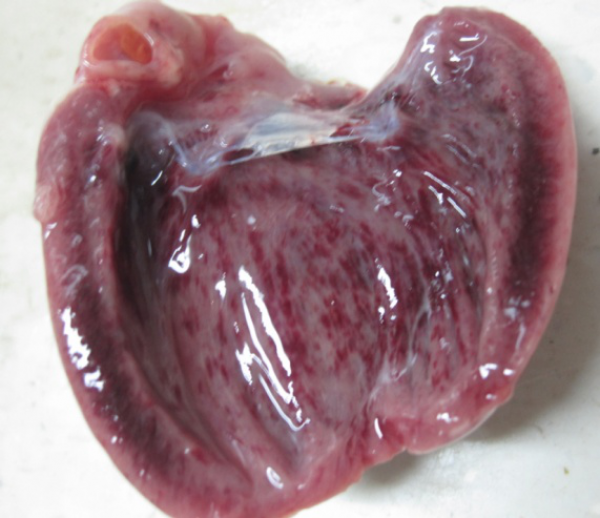 心內外膜出血;腦膜水腫、出血;肺臟先是一側出血發黑,后兩側出血發黑;肝臟腫大,顏色多數發黃發白,類似腺病毒;脾臟腫大、出血,似大理石樣花斑;腎臟腫大、出血,似花斑樣;有的腺胃乳頭出血;胰臟出血。