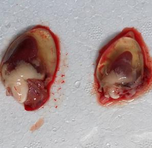 (2)心包積液綜合征:剖檢病變主要表現為心包腔內有黃色清亮水樣或膠凍樣液體,心肌柔軟,有壞死點。肝臟腫大、質脆易碎、有壞死灶;脾臟腫大;肺水腫、充血等。